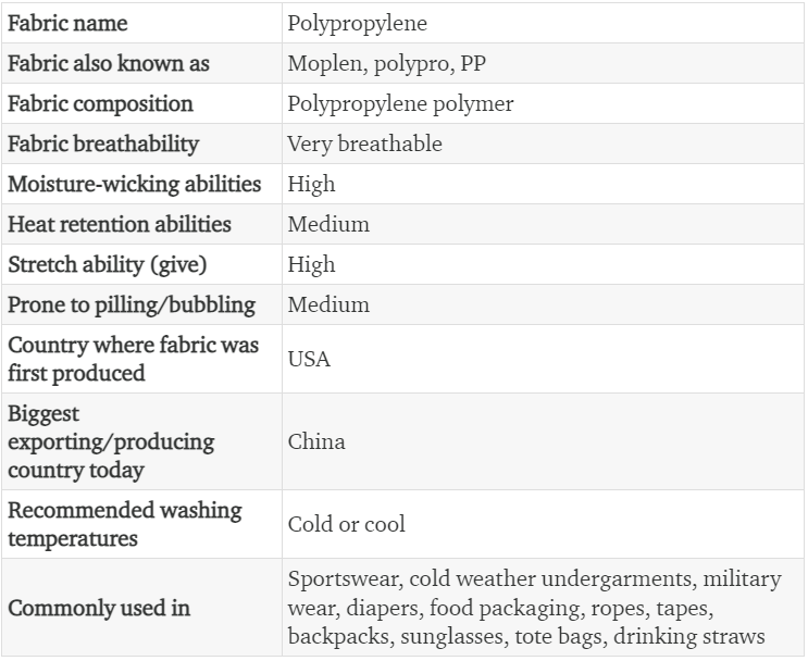 Raws li kev siv polypropylene tau dhau los ua ntau thiab nrov hauv ntau cov neeg siv khoom thiab kev siv hauv kev lag luam, nws tau maj mam pom tias hom yas no kuj pom muaj peev xwm ua cov ntaub ntawv. Polypropylene ntaub yog nonwoven textile, uas txhais tau hais tias nws yog tsim los ntawm cov ntaub ntawv ncaj qha yam tsis muaj kev xav tau rau spinning ntawm weaving. Cov txiaj ntsig tseem ceeb ntawm polypropylene li ntaub yog nws cov peev xwm hloov dej noo; Cov ntaub ntawv no tsis tuaj yeem nqus tau cov dej noo, thiab hloov pauv, noo noo dhau los ntawm polypropylene ntaub nkaus.